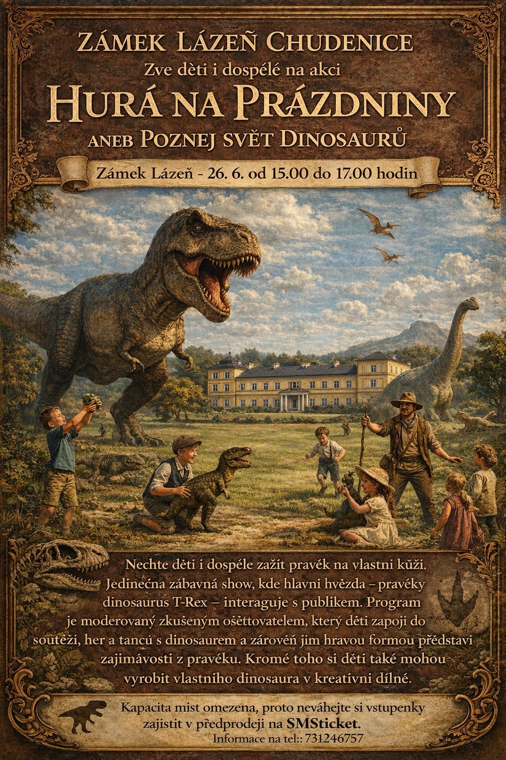 Interaktivní odpoledne pro děti a jejich rodiče. Těšit se můžete na živého dinosaura (mrká, hýbe se, vydává zvuk, animátora v kostýmu který vás seznámí se světem dinosaurů. Přichystaná je tvořivá dílna a další soutěžní aktivity o ceny. Kapacita míst je omezena.