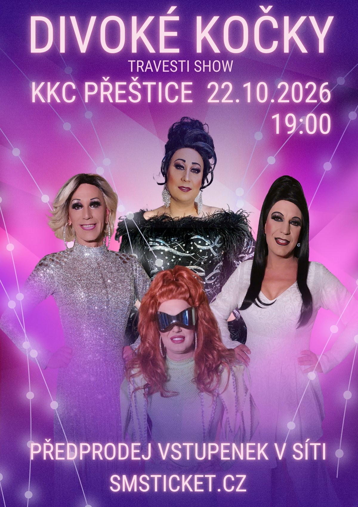 Travesti skupina Divoké kočky z Ostravy přijíždí se svým novým programem do KKC Přeštice, kde vystoupí 22.10.2026 v 19:00 pro své věrné publikum a diváky ze širokého okolí na sále kulturního a komunitního centra Přeštice. Skupina Divoké kočky do západních Čech jezdí od roku 2010 a pravidelně vystupují ve městech v okolí Plzně. Celovečerní zábavný program je plný nezapomenutelných legračních scének, písniček, známých zpěvaček, krásných kostýmů, situačního humoru, smíchu a je vhodný jak pro ženské tak pánské publikum. Jejich vystoupení se těší stálé větší oblibě a tak si každý divák přijde na své. Přijdte se sami přesvědčit, že na travesti představení není nic špatného a v podání ostravských umělců se budete určitě dobře bavit.